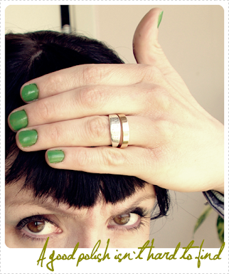 I've had a horrible night and a pretty bad day but there it was, a polish from the giveaway I won at Nails etc to the rescue. A lovely pea-green polish that's almost opaque after one coat and it's so easy to work with. After the Isadora massacre, this was just what I needed to get going again. Above is a one coater applied 2 minutes before I had to run off and pick Iggy up at the daycare.