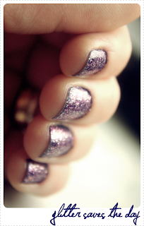 On my 2nd attempt, I used no basecoat, just one layer of Blue jeans and then waited 4 hours until I put on Wet n Wild's glittercoat Sparked. Guess which polish stained the brush and tried to bleed into the clear polish? I had to clean the brush before putting it back into the bottle each time.