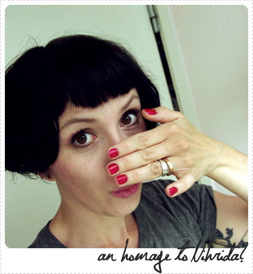 Above you see the Orly in question, one coat of my beloved Mandalay Ruby, and I am trying to mimic Nihrida and her pose, but either my hand's too big or my head too small, because I just can't get it to work. I guess it takes hard work and practise.